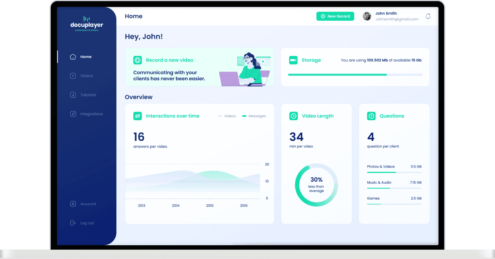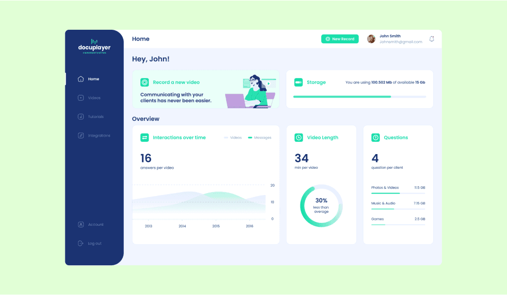 Home dashboard in DocuPlayer was conceived as a centralized hub for displaying crucial metrics, providing users with valuable insights into the time spent and demands of each client. However, during a demo presentation, we observed a degree of uncertainty among users regarding where to initiate video recording. To address this issue we introduced a user-friendly card prominently displayed alongside an always-visible button in the top bar.