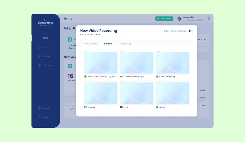 Recording a video is as straightforward as it gets. Users simply click the "Record" button, opening a modal (pop-up) where they can choose which screen to share from options like "Entire screen," "Window," and "Chrome tab." Each option displays a thumbnail of the selected screen, ensuring clarity in their choice.