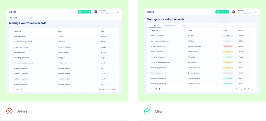 The initial design for the Videos Page featured two sub-pages: "New Videos" and "Sent Videos." To ensure the most this experience, I organized and conducted a dedicated demo session focused on gathering feedback regarding the information architecture. During this session, users expressed uncertainty about the term "New Videos" and encountered difficulties in distinguishing when a question remained unanswered.