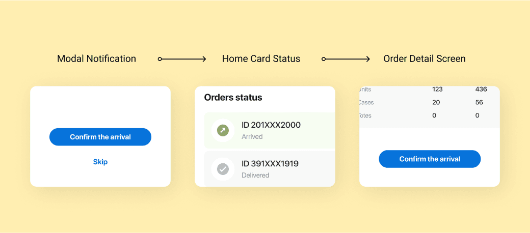 After pressing the "Confirm the arrival" button, the user is directed back to the list page, and the related order card's status is changed to "delivered." The order card is then moved to the delivered section, ensuring that the user can easily differentiate between delivered and pending orders.