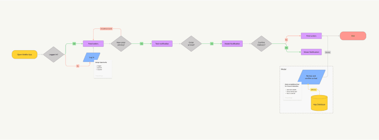 In the user flow, we focus on enhancing the experience for Walmart receivers. As they open the mobile app, we ensure a seamless journey. Logged in? Yes, we feed in incoming orders. When a new order arrives, a friendly toast notification pops up. Once the delivery is at the door, a modal notification seeks confirmation. This intuitive interaction ensures accurate inventory and smart storage choices. If they confirm, the process wraps up.