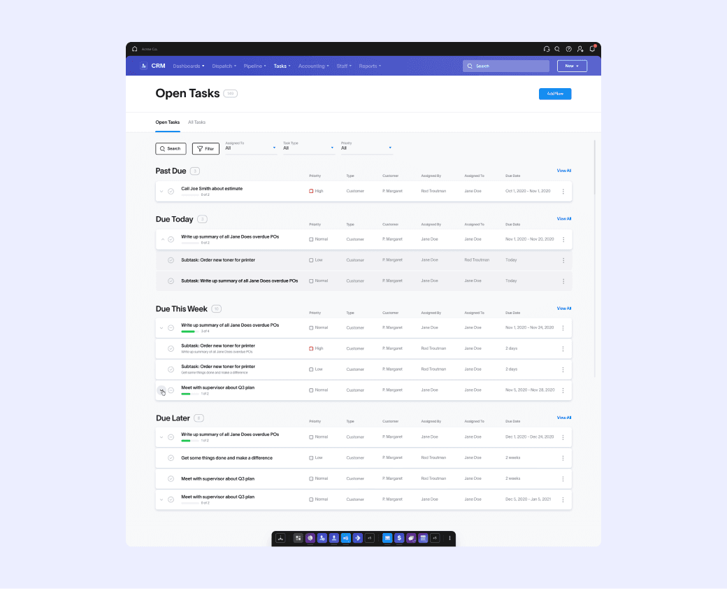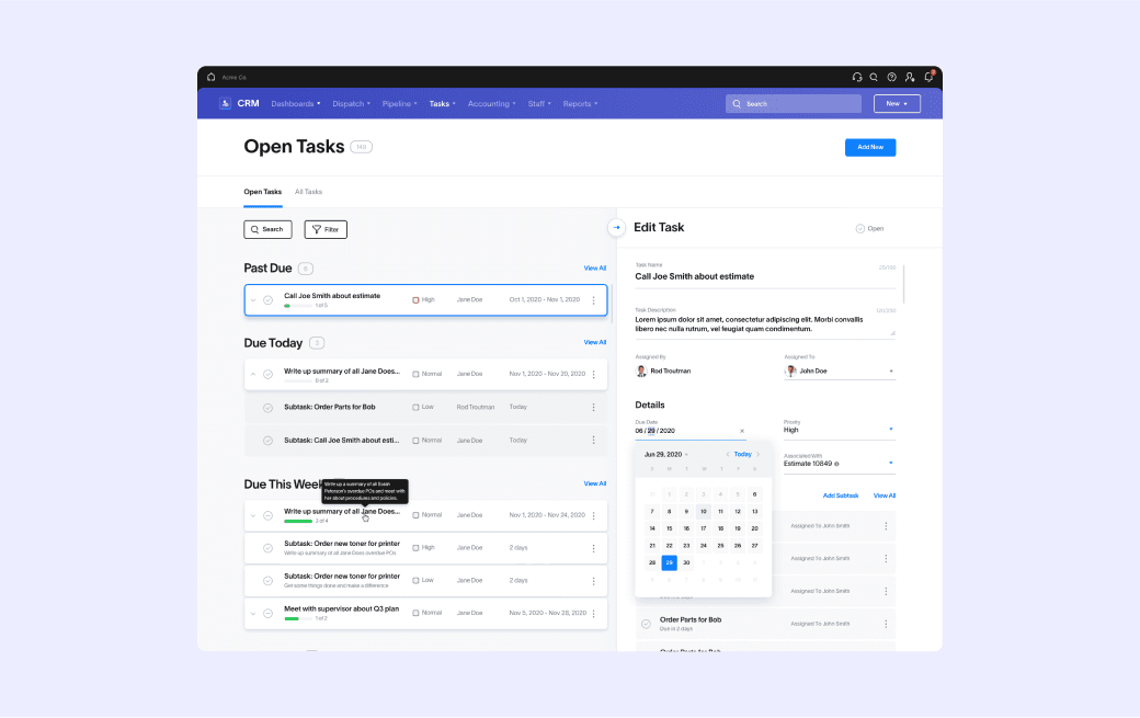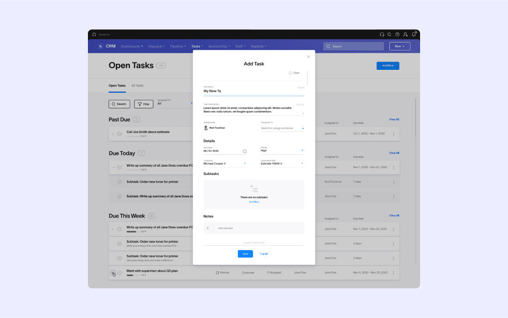 In this project, I led the discovery, vision, and design of the Tasks App within Scorpion's CRM Platform. I refined feature specifications, conducted research, crafted prototypes, and collaborated closely with product managers and engineers to ensure seamless design implementation. Furthermore, I assumed the role of design lead for new billing and CRM apps, contributing to the expansion of the Scorpion Platform's functionalities.